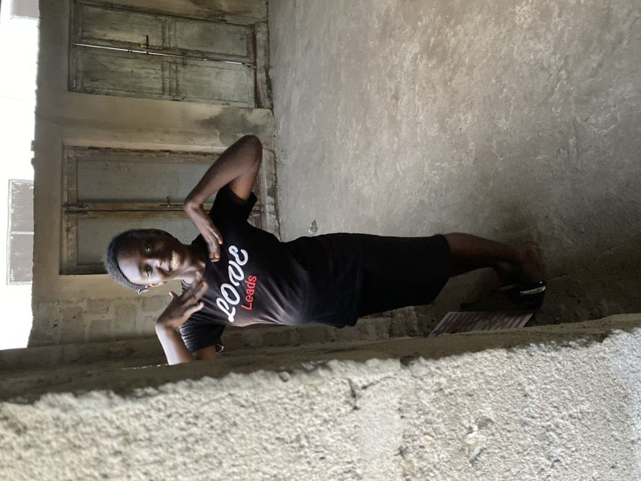 A person wearing a black shirt with the words "Love Leads" is doing a side plank. The person is smiling and has both hands near their face. The background includes a wall and a window with closed shutters. The photo is taken at a low angle.