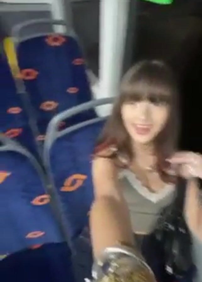 interior of a bus at night. A young woman with brown hair and bangs is seen briefly in the first shot. The bus appears empty, with rows of blue and orange patterned seats. The camera pans toward the rear of the bus showing gray seats and yellow handrails. The lighting inside is bright, and the windows show dark outside.