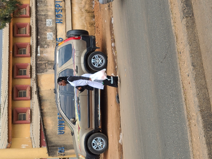 The image depicts an outdoor street scene in Jos, Nigeria, adjacent to a building identified as a university hospital