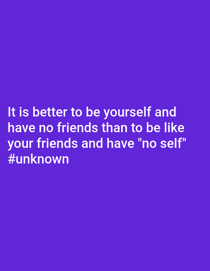 The image displays a solid, uniform purple background. Centered horizontally and occupying the lower half of the frame, white sans-serif text is present. The text reads: "It is better to be yourself and have no friends than to be like your friends and have 'no self' #unknown". No specific location within the city of Meknes, Morocco, or any other geographical indicator is depicted. The scene contains no people, physical subjects, discernible objects other than the text itself, actions, or interactions. The environment is a monochromatic digital display.