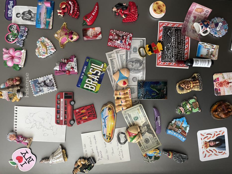 The image displays a cluttered, top-down view of a grey metallic refrigerator door, identified by the "Hisense" brand logo in the upper center, located in Saint-Denis, France. The surface is densely adorned with approximately 50 various magnets, personal notes, and currency, arranged as a collection of souvenirs and household items. **Primary Subjects and Objects:** * **Magnets:** Numerous magnets depict global travel destinations, landmarks, and cultural symbols. These include an "I ❤️ NY" apple, a London red double-decker bus, a miniature Eiffel Tower, a Thai hibiscus flower, an Alaskan husky, a Brazilian license plate ("RIO DE JANEIRO BRASIL"), a Spanish coastal scene ("L'ESCALA"), two distinct "TIGNES" magnets (one winter sports, one patterned), a Senegalese abstract art magnet, an Albanian triple-figure magnet, a "MARMARIS" blue bikini buttock magnet, a Portuguese bottle opener, a German country outline, a Munich cityscape, a Balinese scene, an Ardèche canoe, a South African figurine, and a Lisbon wine bottle. Figurative magnets include an elderly woman, a flamenco dancer, a Venetian mask, a dancing couple, a portrait of Queen Elizabeth II, a "Pays Basque" chili pepper, a Saint Anthony-style figure, and an Oktoberfest man with beer. Miscellaneous magnets include a heart-shaped candy magnet, an "ALPES" heart, a "DEUS" logo, a "BRUXELLES" mosaic, and a Union Jack mug. * **Paper Items:** A small notepad with a pencil sketch of a seated person is secured. A black and white photo of a man labeled "Leola" is present. A white sticky note with handwritten French text ("Hello la Coloc", "Je rejoindrai quatres", "vous êtes super") is visible. A larger white rectangular paper featuring a skeleton motif and French text, and a white square magnet displaying a photo of a woman wearing a crown against a sausage-patterned background are also present. A pinkish banknote, likely a Sri Lankan 20 Rupee, is secured on the lower right. * **Currency:** Two U.S. twenty-dollar bills and one U.S. one-hundred-dollar bill are prominently displayed, held in place by magnets. The objects are static, uniformly adhering to the metallic surface, suggesting a personalized collection of mementos and functional household organization.