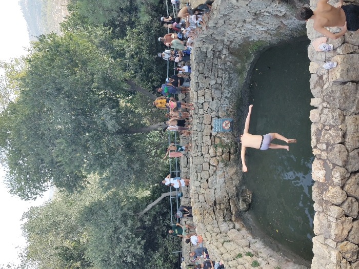 The image displays an outdoor scene at a stone-lined pool, likely a natural spring or well, located within the Mate Yehuda Regional Council, Israel. A male individual, shirtless and wearing grey swim trunks, is captured mid-jump with arms outstretched, suspended above the dark, murky green water. Approximately two dozen individuals, including adults and children, are distributed around the pool's perimeter. Some are seated or standing directly on the stone coping, while others are positioned behind a low metal railing visible on the far side. A second male individual, wearing dark swim trunks, stands on the stone edge in the immediate foreground, facing away from the camera, with light-colored footwear placed beside him. A sign with an exclusionary symbol (red circle with diagonal line) and text is affixed to the stone wall on the far side of the pool, above the water level. The background consists of dense green foliage and trees, with a distant hillside featuring scattered buildings under a bright sky.