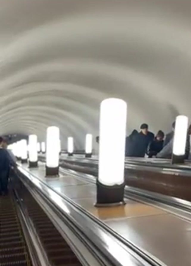 n escalator in an underground station with people riding up. The escalator has bright, cylindrical lights on the sides. The ceiling of the tunnel is curved and white. People are wearing winter clothing.
