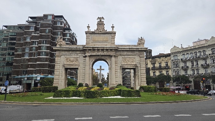 - "The image presents an urban landscape centered on the Puerta del Mar monument in Valencia, Spain, under an overcast sky" by FM-eQMAb2, licensed under CC BY 4.0
