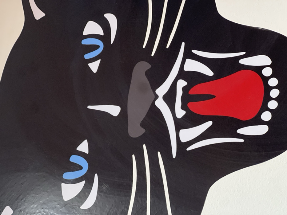 The image features a stylized, black panther head in a flat, graphic style. The panther has simplified, abstract features, including blue eye accents and white whiskers. Its mouth is open, revealing a bright red tongue surrounded by white teeth. The overall impression is a bold, contemporary design, likely a decal or print, emphasizing the animal's ferocity through stark color contrasts and exaggerated features.