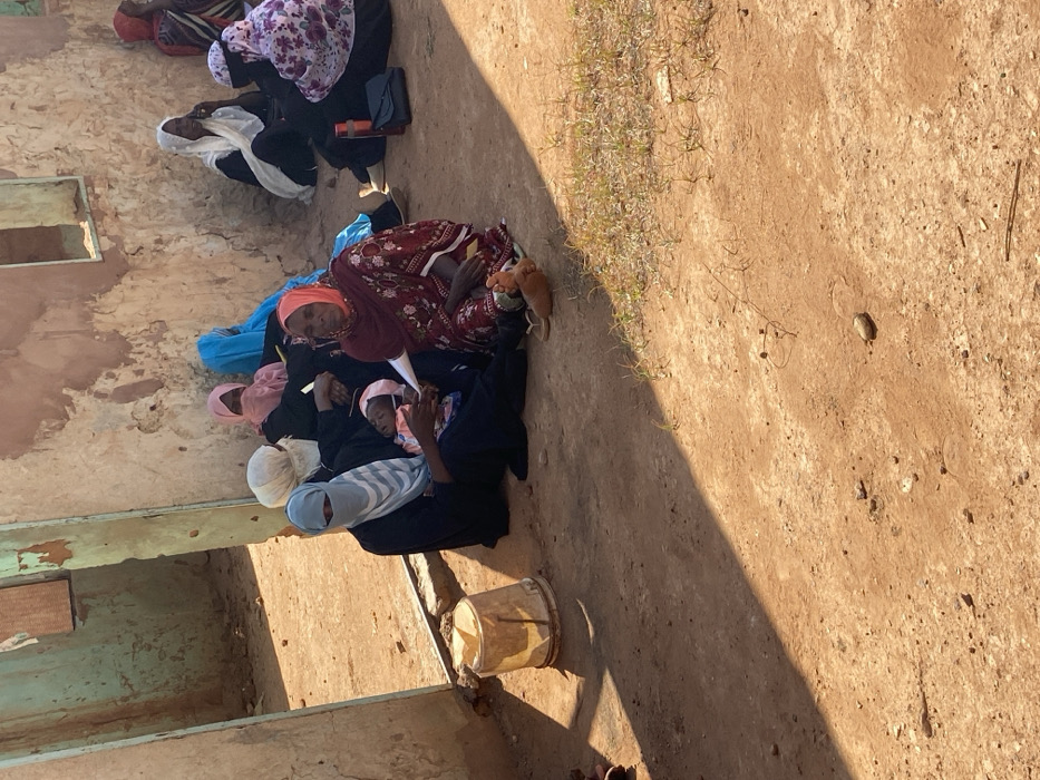The image depicts an outdoor scene in Omdurman, Sudan, featuring a group of approximately ten to twelve individuals, predominantly women, and at least one infant, gathered against a dilapidated building