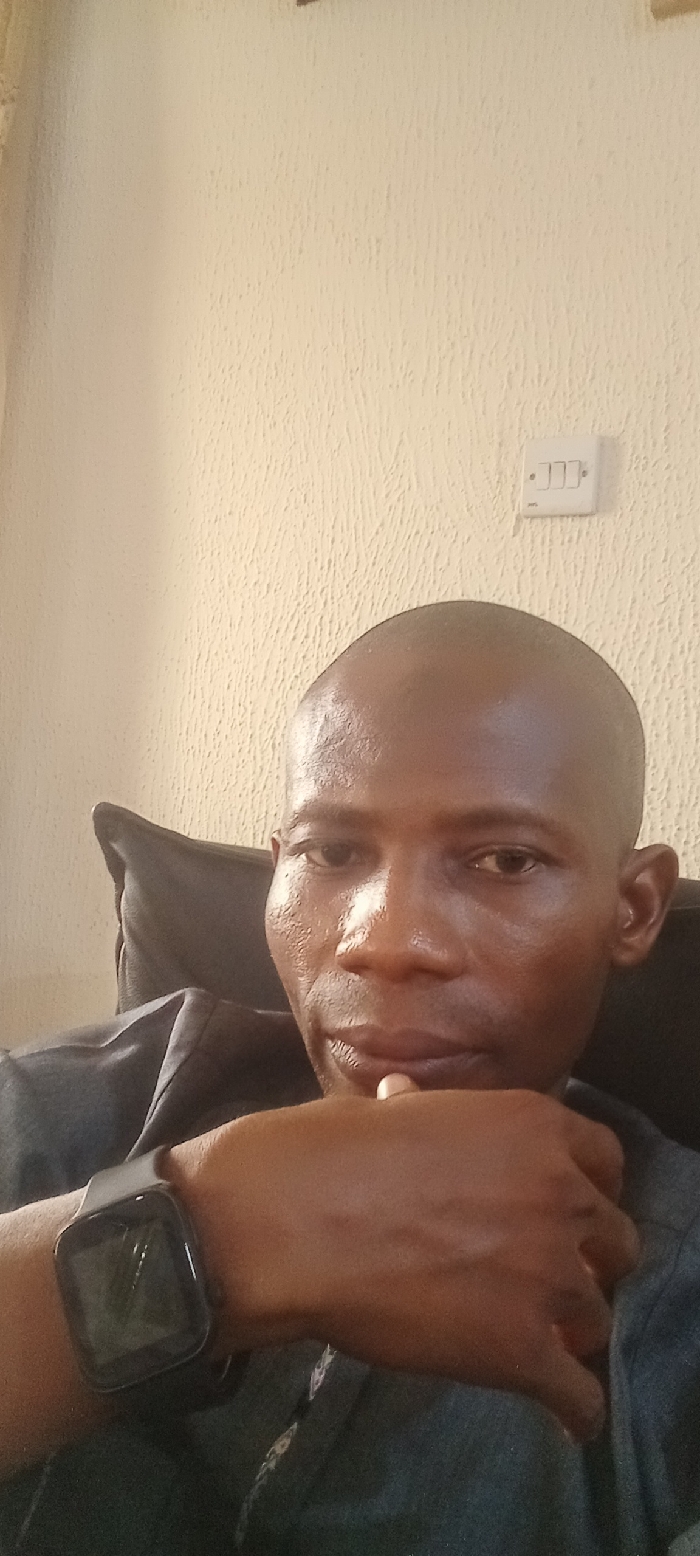 An adult male with a dark complexion and shaved head is depicted seated indoors in Lokoja, Nigeria
