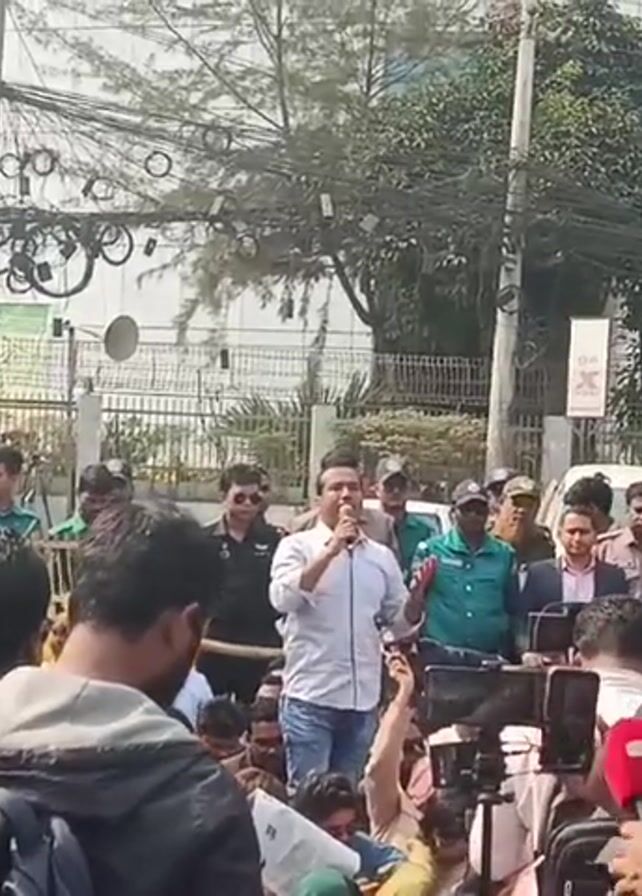 A man speaks into a microphone in front of a crowd of people, some of whom are holding up cell phones to record him. The man is wearing a light-colored shirt and blue jeans. He is standing in front of a barrier with police officers behind it. Behind the police officers is a white van and a building. The crowd is a mix of men and women, and they appear to be listening attentively to the speaker.