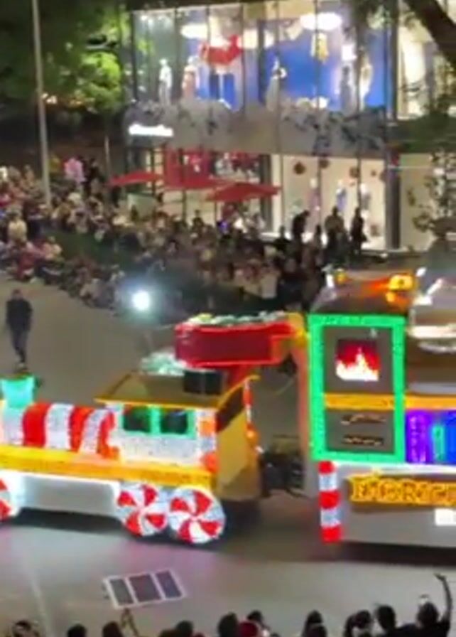 brightly lit Christmas parade float traveling past a crowd of people at night