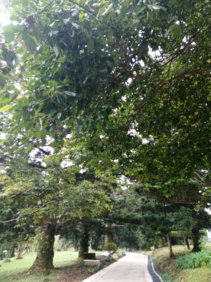 A walkway lined with lush greenery leads into a forest-like area. Trees with dense foliage dominate the scene, creating a natural canopy. The walkway appears to be paved, and a drainage system runs alongside it. The lighting suggests an overcast day, with filtered sunlight reaching the path. The overall impression is that of a peaceful, verdant landscape designed for leisurely strolls.