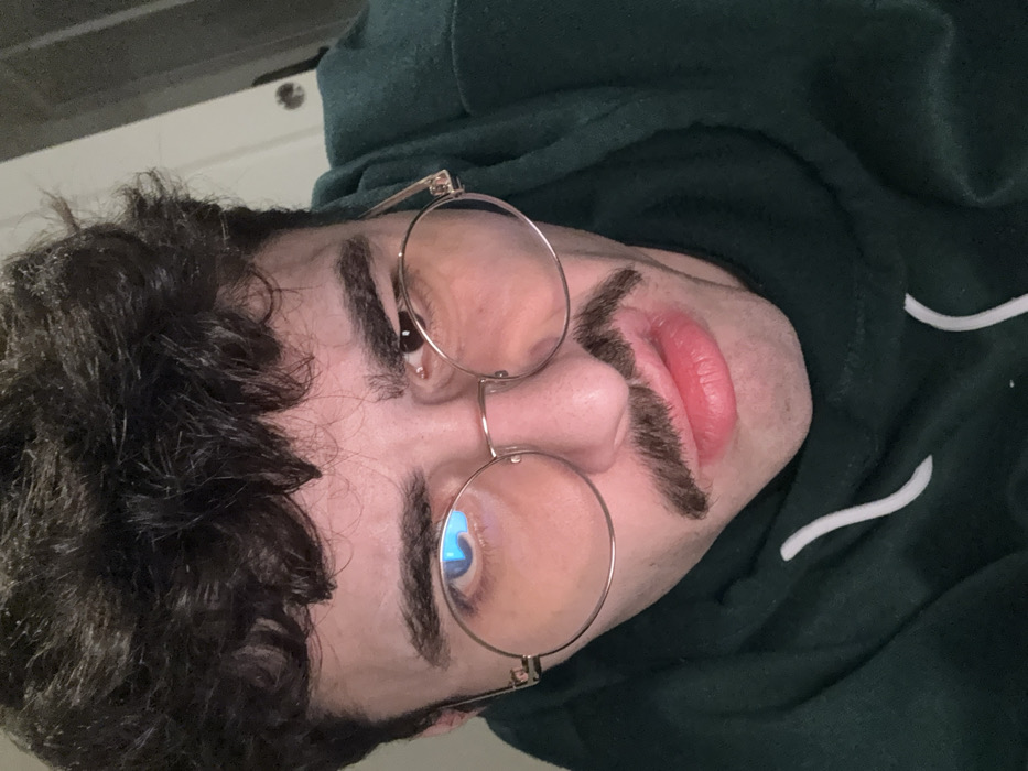A person with curly brown hair and round, gold-rimmed glasses looks at the viewer. Dark eyebrows and a pasted-on, dark mustache sit above rosy lips. The person wears a dark green hoodie with white drawstrings. The image is angled, with the top of the frame showing a glimpse of a white surface.