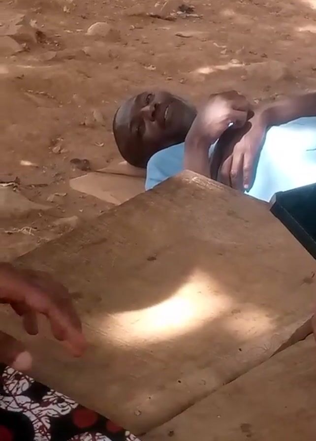 A video shows a man lying on the ground outside, looking up and smiling. He is wearing a light blue shirt. A wooden table is in the foreground, partially obscuring the view of the man. A black smartphone is held in someone's hand near the table, seemingly filming the man. The ground is dirt and there's a motorbike parked in the background.