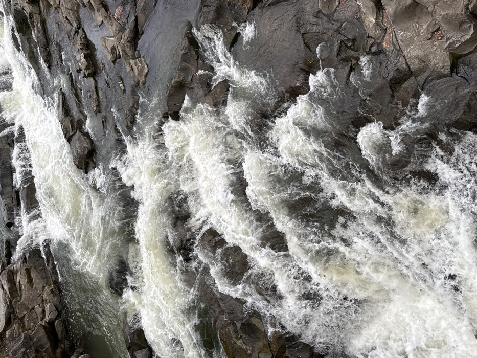 The image displays a detailed, high-angle view of the Probiy waterfall, a natural landmark in the city of Yaremche, Ukraine. The scene is dominated by a turbulent flow of water cascading over a rock-strewn riverbed. The water exhibits a dynamic range from opaque white foam and aerated rapids in the central and lower portions to darker, clearer grey-green sections in calmer pockets and along the banks. Numerous irregular, dark grey and wet rock formations, ranging in size from small stones to large, flat slabs, define the river's course, creating multiple cascades and eddies. The rocks appear slick with water and lack significant vegetation. No human subjects, animals, or artificial structures are visible within the frame. The lighting is even, suggesting an overcast condition, illuminating the water and rock textures without casting harsh shadows. The overall action depicted is the continuous, powerful downward movement of water over and around natural stone obstacles.