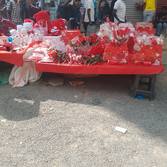 The image depicts an outdoor vendor stall in Nairobi, Kenya, under daylight conditions. A rectangular table draped with a plain red tablecloth displays a variety of red-themed merchandise. On the table, from left to right, are multiple red teddy bears of varying sizes, several smaller white teddy bears, clear plastic bags, numerous artificial red roses arranged in bouquets or individually wrapped, and various red gift boxes and bags featuring rose and heart motifs. Small red, rectangular packages, possibly candy or small gifts, are also distributed across the display. In the background, out-of-focus individuals in casual attire, including plaid and solid-colored shirts, are observed standing and moving. Behind these figures, a building facade with metallic roll-down shutters is visible, suggesting commercial premises. The foreground consists of a coarse, light-colored gravel surface. Visible debris on the ground includes a white paper wrapper and a coiled green string. Beneath the table, a white cloth bag, a green bag, and a dark grey plastic stool are present, along with loose building materials such as bricks or stones. No specific actions or direct interactions among the background persons are clearly discernible.