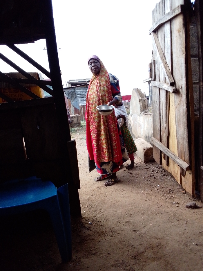 The image depicts an outdoor scene in Lokoja, Nigeria, centered on an elderly woman and a child on unpaved ground