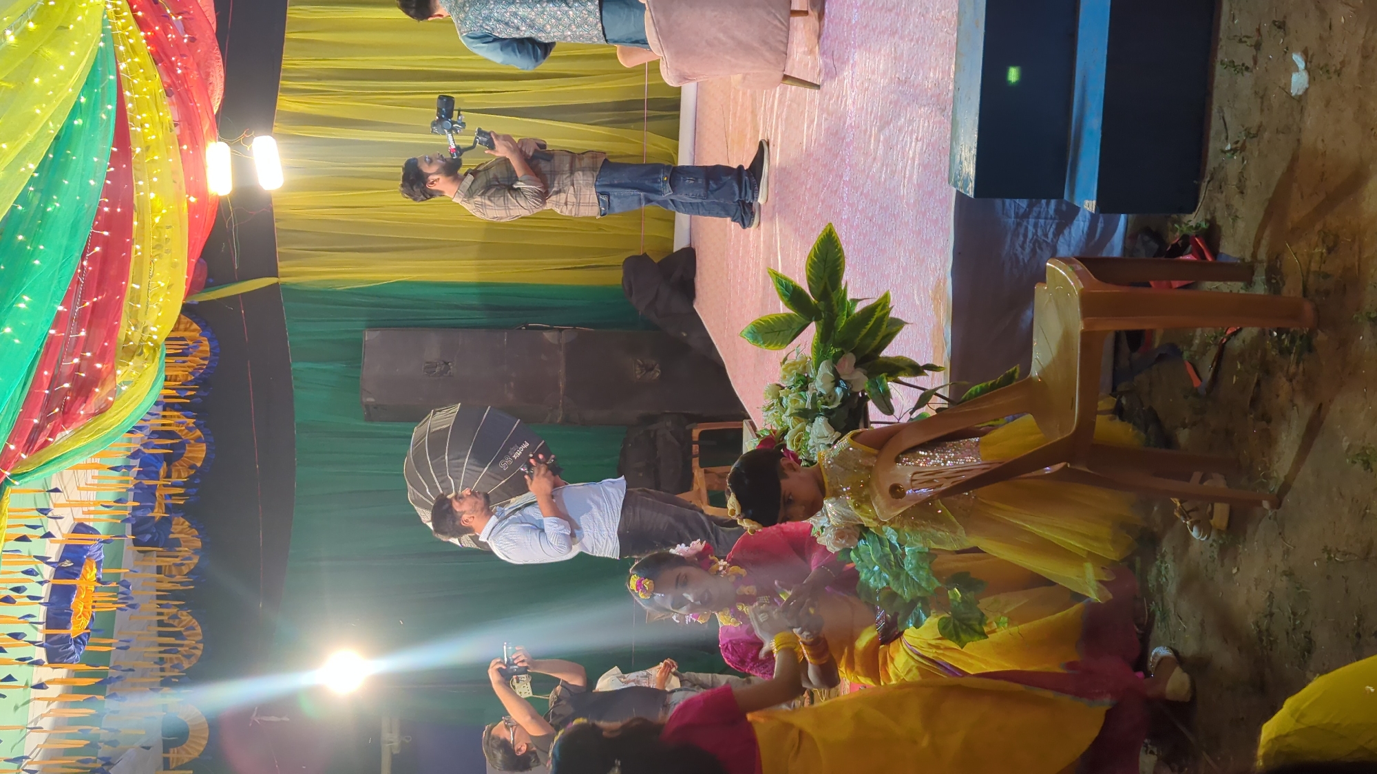 The image depicts a staged event occurring outdoors or in a temporary structure in Savar, Bangladesh, likely during evening hours due to artificial lighting. The overhead area is covered by a canopy of red, yellow, and green fabric draped with string lights, along with blue and yellow fabric swags. A raised stage, covered in light pink material, occupies the central and right portions of the frame. A green and yellow fabric backdrop is visible behind the stage. On the stage, from left to right: * A man in a light blue patterned shirt and dark trousers stands near a large black speaker and a black umbrella softbox, holding a camera with an attached flash. * A woman, adorned with yellow and pink floral garlands in her hair, wears a pink top and a yellow sari. She is seated on the stage, holding a mobile phone or small object. * A young child, wearing a yellow sequined dress, stands beside a light brown plastic chair. White floral arrangements with green leaves are placed on the stage near the child and the seated woman. * Further right, a man in a brown checkered shirt and blue jeans holds a video camera mounted on a gimbal stabilizer, facing towards the left. * A partial view of another man in a blue patterned vest and a light-colored armchair is visible on the far right of the stage. Off-stage, on the left, a woman in a pink top and yellow sari is partially visible from the back, interacting with the seated woman on stage. Behind her, a man wearing glasses and a dark shirt holds a camera with a flash attachment, aiming towards the stage. The ground area in the foreground and beneath the stage consists of bare earth with scattered debris and sparse vegetation. Multiple bright artificial lights illuminate the scene, including two rectangular overhead lights above the stage.