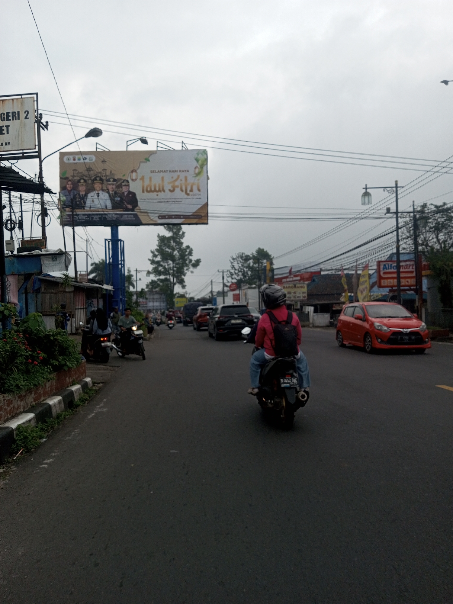 The image depicts a street scene in an urban or semi-urban area under an overcast sky. A dark paved road occupies the central and lower portions of the frame. In the immediate foreground, a person wearing a black helmet, red long-sleeved shirt, blue jeans, and a black backpack is riding a dark-colored motorcycle away from the viewer. The motorcycle displays an Indonesian license plate, "B 4652 BRE." To the left, a concrete curb with black and white stripes borders a planter containing green foliage with some red berries. Further down the road, traffic is visible, including multiple motorcycles and cars. On the left side of the road, utility poles support numerous overhead power lines that crisscross the sky. Below these lines, a large billboard is erected, featuring images of several individuals in formal attire and text that includes "SELAMAT HARI RAYA Idul Fitri" (Indonesian for "Happy Eid al-Fitr"). Next to the billboard, simple structures, appearing to be small shops or dwellings made of corrugated metal and other materials, line the roadside. A white sign, partially obscured, shows text like "NEGERI 2" and "3 KM." On the right side of the road, a red car, possibly a Toyota Agya, is parked or moving slowly. Beyond it, a building with an "Alfamart" convenience store sign is visible. Other buildings and trees are present in the mid-ground and background on both sides of the street. Streetlights with decorative fixtures are also scattered throughout the scene. The overall environment suggests active vehicle traffic and commercial activity. Based on the Indonesian text on the billboard and the format of the license plate, the location is identified as Indonesia, not Houaythat, Laos.