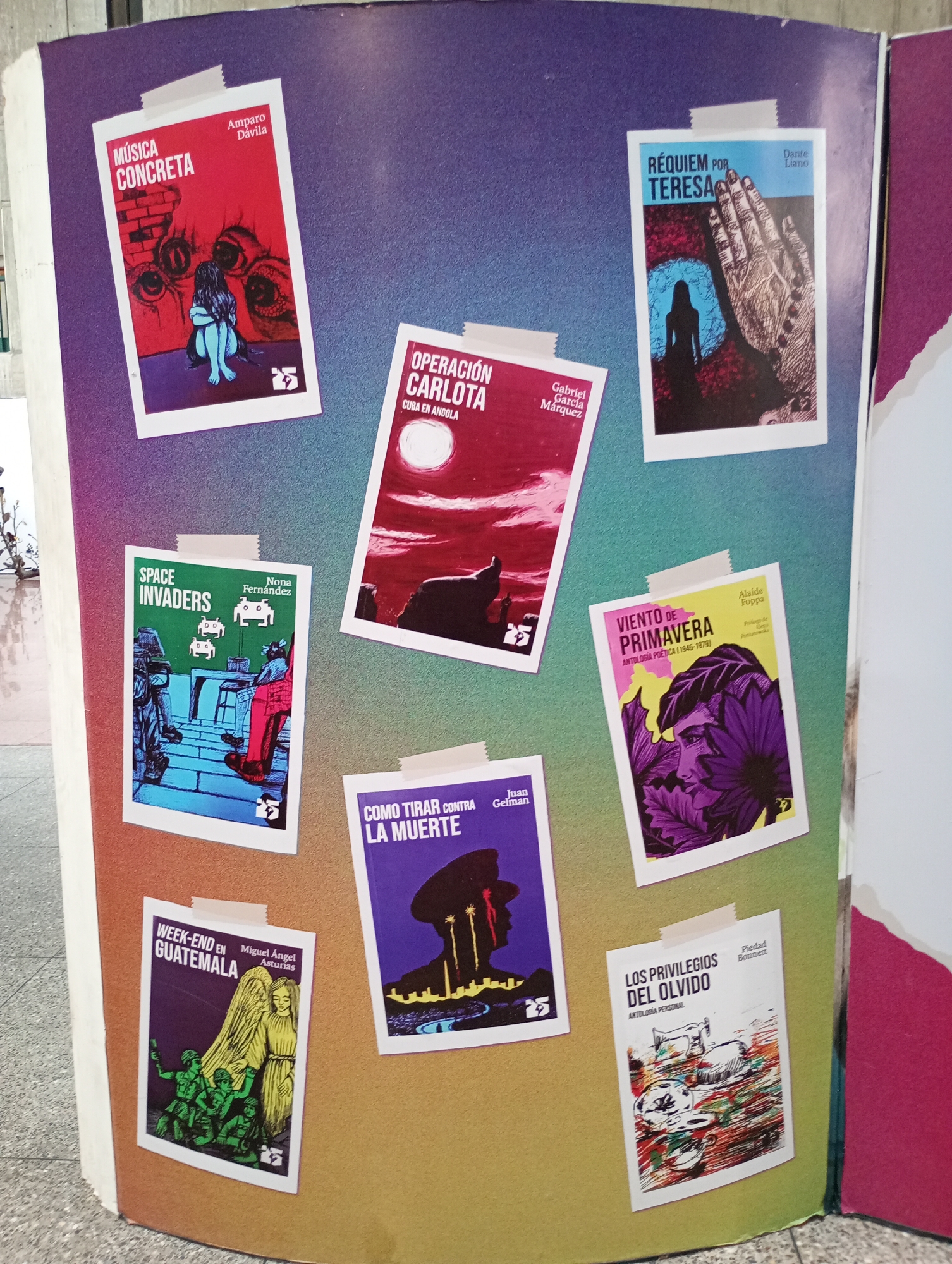 The image depicts a curved display board with seven book covers affixed to its surface using what appears to be tape. The board is divided into vertical color blocks that transition from purple and blue on the top left, to red and orange in the middle, and green and yellow on the right. The book covers are arranged in a seemingly random fashion. The book covers and their respective authors are: "Música Concreta" by Amparo Dávila, "Operación Carlota Cuba en Angola" by Gabriel García Márquez, "Réquiem por Teresa" by Dante Liano, "Space Invaders" by Nona Fernández, "Viento de Primavera Antología Poética (1945-1979)" by Alaíde Foppa, "Como Tirar Contra La Muerte" by Juan Gelman, "Week-end en Guatemala" by Miguel Ángel Asturias, and "Los Privilegios del Olvido Antología Personal" by Piedad Bonnett. The display board is located indoors. The tiles can be seen on the floor indicating that the board is standing near the Caracas subway.