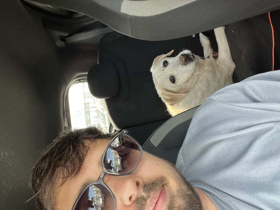 The image depicts a male individual and a dog inside a vehicle during daytime