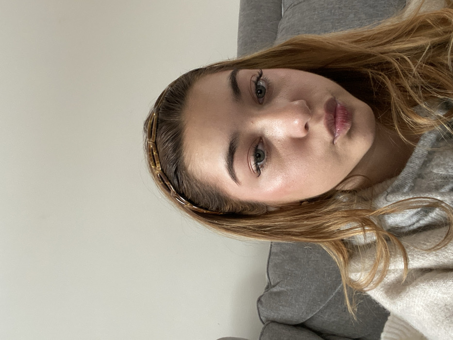 A frontal, chest-up portrait depicts a young female situated indoors in Täby, Sweden. The subject has light brown hair, styled with a tortoiseshell-patterned headband, and possesses light-colored eyes. Her lips are slightly pursed, and her complexion appears naturally blushed. She is wearing a light-colored, textured knit sweater. The background consists of a plain, light-colored wall above a section of a gray, upholstered sofa or cushion.