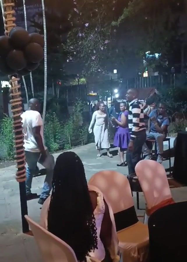 group of people enjoying an outdoor gathering at night. Several individuals are seen dancing on a paved area. A man in a white t-shirt and jeans is dancing energetically in the foreground. In the background, a woman in a white dress is dancing with another person. A man in a striped shirt is standing and watching. Several people are seated in chairs, observing the festivities. There are palm trees and other vegetation in the surrounding area, along with decorative elements like black balloons. The scene is lit by overhead lights, creating a lively ambiance.
