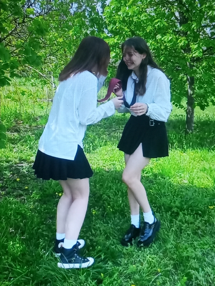 The image displays two young females in an outdoor green space, presumably a park, within the city of Wrocław, Poland. The precise location is not identifiable from visible landmarks. Both individuals, appearing to be adolescents, have long, dark hair and are dressed in similar attire: white long-sleeved shirts and black mini-skirts. The female on the left, viewed from behind her right shoulder, wears a pleated black mini-skirt and black high-top sneakers with white soles and white socks. She holds a burgundy-colored necktie in her hands, extending them towards the chest area of the other female, suggesting an action related to adjusting or untying the tie. The female on the right, facing partially left, wears a black mini-skirt featuring a front slit, a black belt with a silver-toned buckle, and black platform oxford-style shoes with white socks. A dark blue necktie is loosely positioned around her neck. She is observed with a wide smile, her head tilted slightly downward, appearing to focus on the tie and the hands of the first female. The ground beneath them is covered in lush green grass, interspersed with small yellow flowers. The background consists of numerous deciduous trees with dense green foliage, indicating a verdant natural setting under bright, ambient lighting conditions.