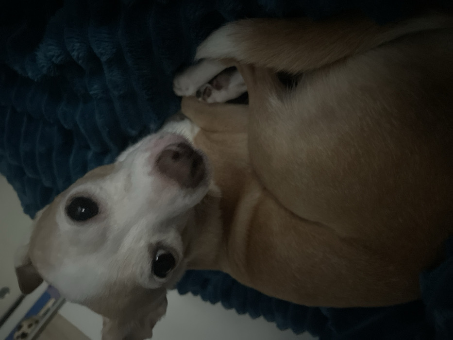 A light tan and white short-haired dog, possibly a small breed like a Chihuahua or Italian Greyhound mix, is depicted in an indoor setting within the city of Esch-sur-Alzette, Luxembourg. The dog is curled up on its right side on a dark teal, textured, possibly fleece or plush blanket. Its head is tilted, and its large, dark eyes are directed forward, engaging with the viewer. The dog's face is predominantly white, with tan markings around its ears, which are partially erect. Its nose is dark brown. One front paw, showing dark paw pads, is visible tucked near its body. The fur on its body is a uniform light tan. The background primarily consists of the dark teal blanket, with a blurry, light-colored vertical surface partially visible in the upper left, indicating a wall or furniture. The lighting is moderate, creating soft shadows.