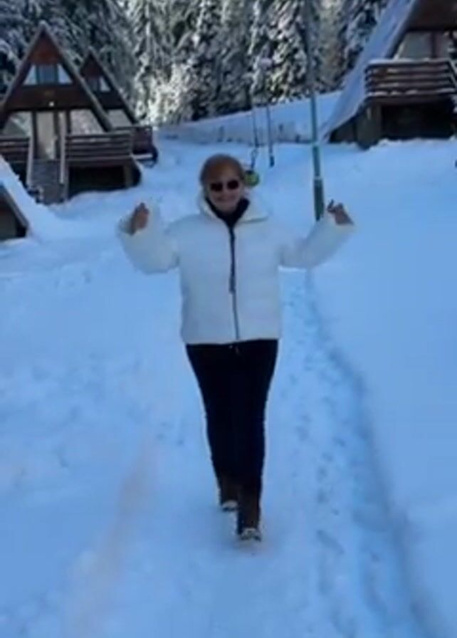 A woman wearing a white jacket, dark pants, and brown shoes walks down a snowy path between A-frame chalets. She is smiling and has her arms slightly outstretched. In the background, snow-covered fir trees reach into a clear blue sky. A baby stroller is visible near one of the chalets. The scene appears to be a winter resort or village.