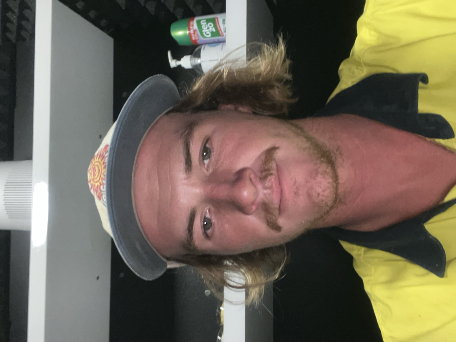 A man wearing a yellow shirt with a dark blue collar and a sun-emblazoned hat is facing the camera. His face is weathered, with a mustache, and his hair is shoulder-length. To his left is a white shelf with cleaning products and a white vertical vent. Dark, sound-dampening panels are in the background, creating a shadowed environment.