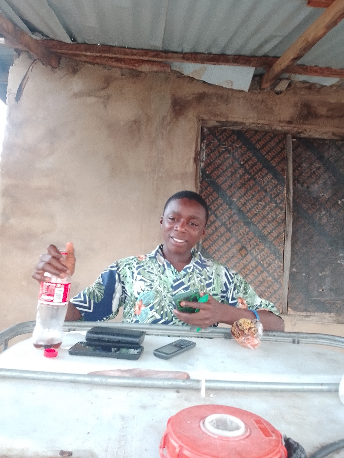 The image depicts a young male in Adankolo, Nigeria, seated at a white surface with a corrugated metal roof overhead