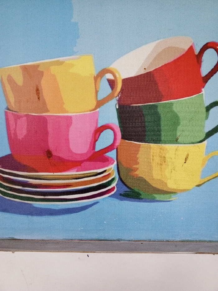 - "This is a digital image of a colorful, stylized painting, likely rendered on canvas due to visible texture, depicting a still life of stacked teacups and saucers against a plain light blue background" by FM-mjzoy2, licensed under CC BY 4.0