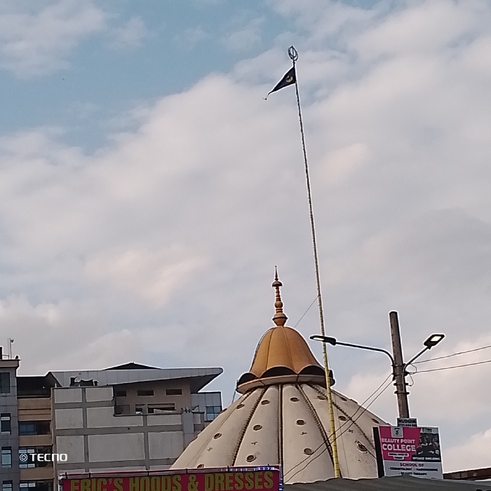 A Nishan Sahib flag, a Sikh religious symbol, flies atop a tall pole above a building with a distinctive, dome-shaped roof with a gold-colored top