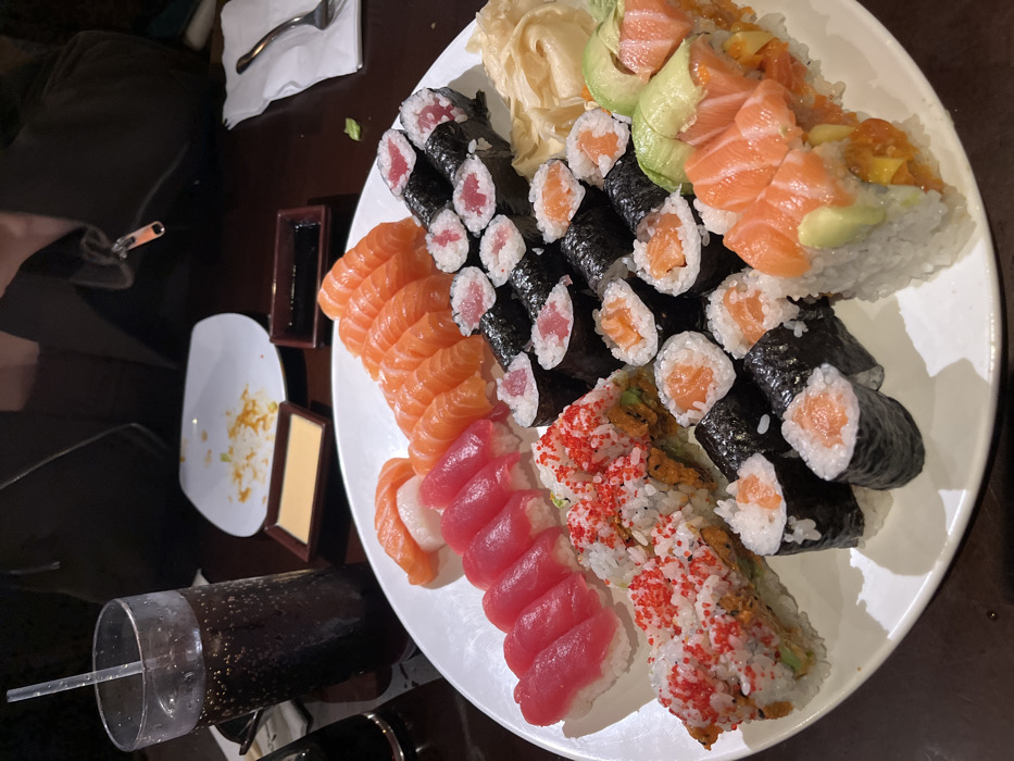 The image depicts a dining table scene in an indoor restaurant within West Windsor, United States. A large white oval platter, centrally positioned, is laden with a variety of sushi and sashimi. This includes approximately eight pieces of red-fleshed fish (tuna) nigiri, one piece of white-fleshed fish nigiri, and approximately eight pieces of orange-fleshed fish (salmon) nigiri. Also present are a maki roll topped with red tobiko, several pieces of tuna maki and salmon maki, and a specialty roll topped with salmon and avocado slices over a yellowish inner filling. A portion of light-yellow pickled ginger (gari) is placed on the platter. On the dark brown table surface, a tall clear glass containing a dark carbonated beverage with a plastic straw is positioned to the left. Two small rectangular dishes hold condiments: one with a light yellow opaque sauce and another with a dark transparent liquid, consistent with soy sauce. A partially consumed white plate with minimal orange food residue and a white napkin with a silver fork are visible in the background. The upper torso and arms of an individual wearing a dark, zippered jacket are partially visible in the upper background. The environment is dimly lit.