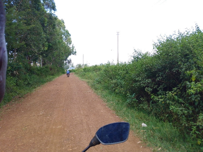 A dirt road stretches into the distance, flanked by lush green trees and bushes. A motorcyclist travels ahead. Overhead power lines suggest a rural or developing area. The foreground features a motorcycle rearview mirror, indicating the image was taken from a moving vehicle. The sky is overcast, casting soft light on the scene. The road's reddish-brown hue contrasts with the vibrant greenery.