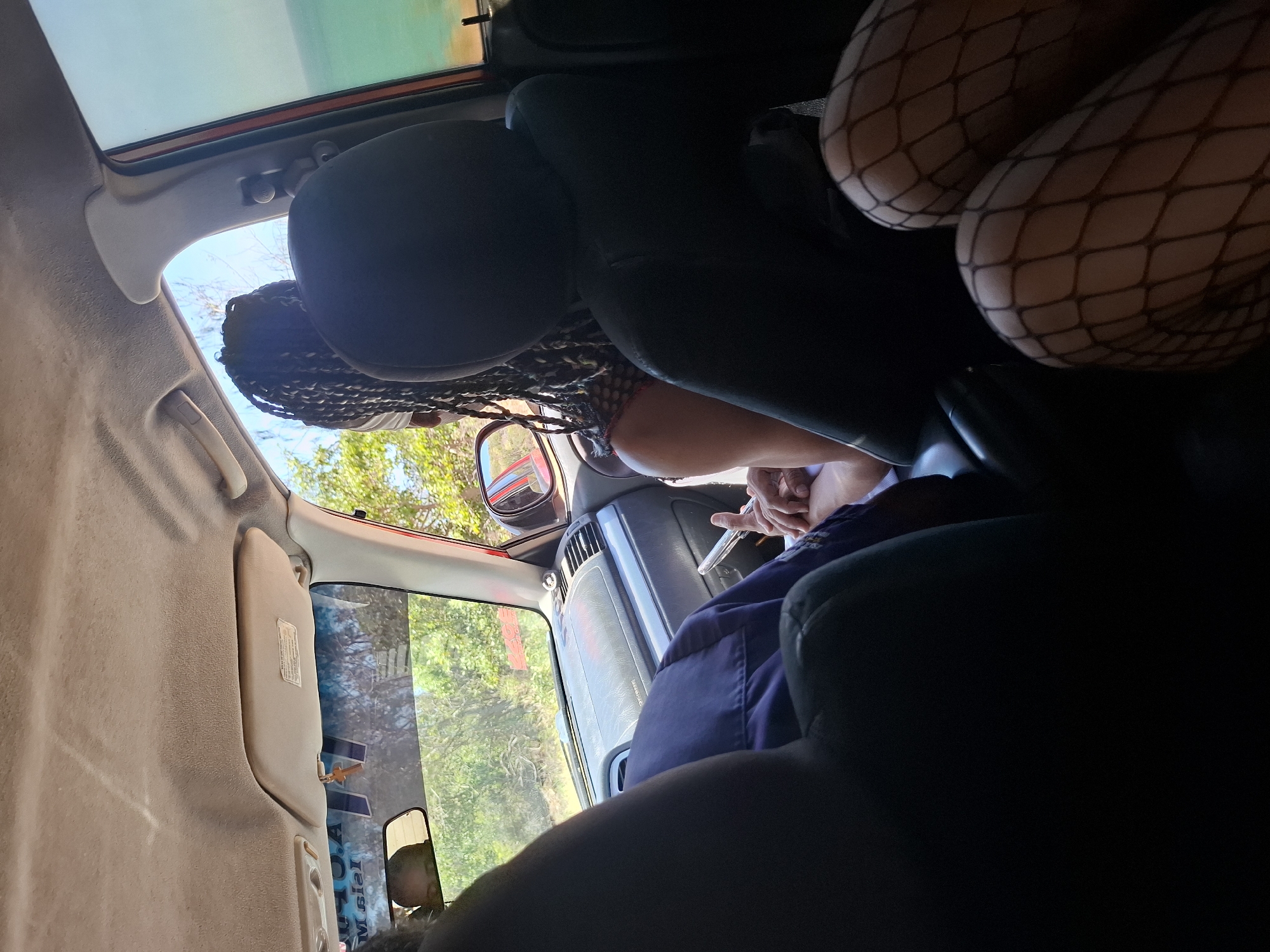 The image depicts the interior of a vehicle, viewed from the rear passenger seat looking forward, located in Pedro González, Venezuela. Three individuals are present. In the foreground, the lower legs of a person wearing black fishnet stockings are visible. In the front passenger seat, a person with dark braided hair, wearing a light-colored top layered over a black fishnet garment, is partially visible from behind. This individual holds a silver-colored mobile phone in their left hand. In the driver's seat, a person wearing a dark blue or purple garment is partially obscured; their hands are clasped in their lap, also appearing to interact with a phone. A reflection of a face is visible in the rearview mirror. The vehicle's interior features a light-colored headliner and sun visors, one displaying a warning label. A small, light-colored, possibly religious, pendant hangs from the rearview mirror. The dark grey dashboard includes visible air vents and an "AIRBAG" inscription on the passenger side. The vehicle's exterior, visible through the doorframe, appears red. Outside the vehicle, the environment is bright and sunny. Through the front windshield, dense green foliage and trees are visible. To the right, through the front passenger window, a large body of turquoise water is seen, consistent with a coastal setting.