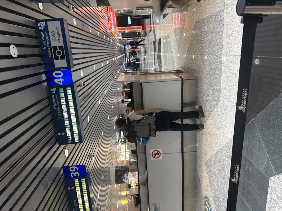 The image displays an indoor immigration hall at Kuala Lumpur International Airport (KLIA) in Sepang, Malaysia