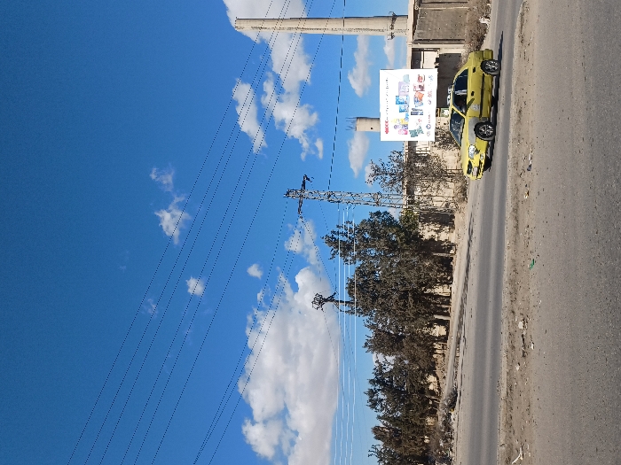 The image presents a daytime street scene in As-Sabina, Syria, under a bright blue sky with scattered white cumulus clouds. Multiple parallel power lines traverse the upper portion of the frame. A two-lane asphalt road runs horizontally through the lower-midground, bordered by a dirt shoulder containing minor debris. A yellow four-door sedan, identified as a taxi by a roof-mounted sign and exhibiting visible damage to its front bumper, is captured in motion, traveling leftward on the road. Behind the road, a line of dense, dark green trees grows on an elevated dirt embankment. A tall metal lattice power transmission tower is positioned among the trees on the right side of the frame. Further right, a large white billboard displaying colorful product advertisements and Arabic text stands in front of several concrete industrial-style buildings. A prominent, tall, cylindrical concrete chimney rises on the far right, with a shorter cylindrical structure visible behind the billboard. No individuals are present in the scene.