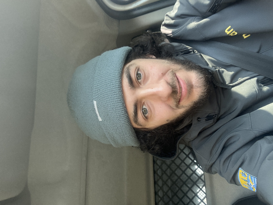 A male individual, appearing to be an adult, is depicted seated inside a vehicle, possibly a commercial van, in Roncq, France. He faces forward, looking directly at the camera with a slight smile. The individual has dark, curly hair visible beneath a light blue-grey knitted beanie, which features a small, white rectangular emblem or tag on its front. He has a beard and mustache and light-colored eyes. He is wearing a dark grey, hooded jacket. A patch with a blue and yellow design is visible on his left sleeve, and partial yellow text, possibly "man," is visible on the right chest/shoulder area of the jacket. A dark-colored seatbelt is diagonally across his chest. Behind him, a light-colored vehicle headliner is visible, along with a metal grid partition to his left, consistent with a cargo barrier in a utility vehicle. The scene is brightly lit.