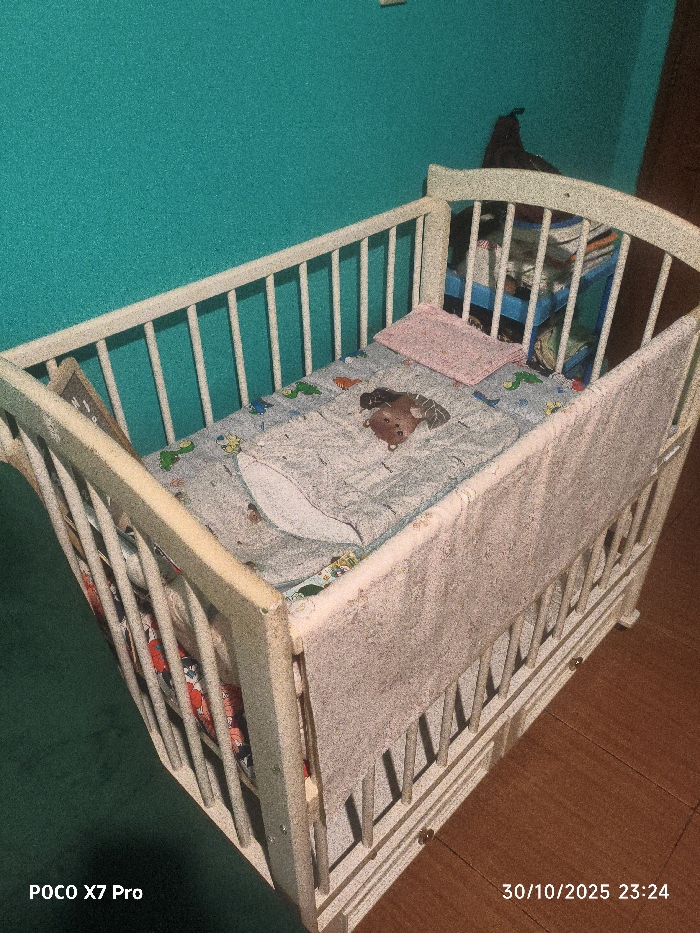 The image depicts an indoor scene in Pacet, Indonesia, at 23:24 on October 30, 2025. A white wooden baby crib is positioned diagonally from the lower left to the upper right of the frame. Inside the crib, a mattress is covered with a light blue fitted sheet patterned with cartoon dinosaurs and caterpillars. A folded small pink textile object, possibly a blanket or pillow, is at the head end of the crib. A brown plush animal resembling a teddy bear lies face down on the sheet near the center. A light-colored textile, likely a blanket or bumper, is draped over the right-side rail of the crib. Below the crib, colorful items are visible through the slats. The background features a solid teal-colored wall with a textured finish. To the right of the crib, a multi-tiered blue shelving unit containing various items is partially visible, with a dark, irregularly shaped object draped over its top. The floor is a uniform brown/orange surface, possibly tiles or wood. No individuals are present in the scene. The image metadata indicates it was captured using a POCO X7 Pro device.