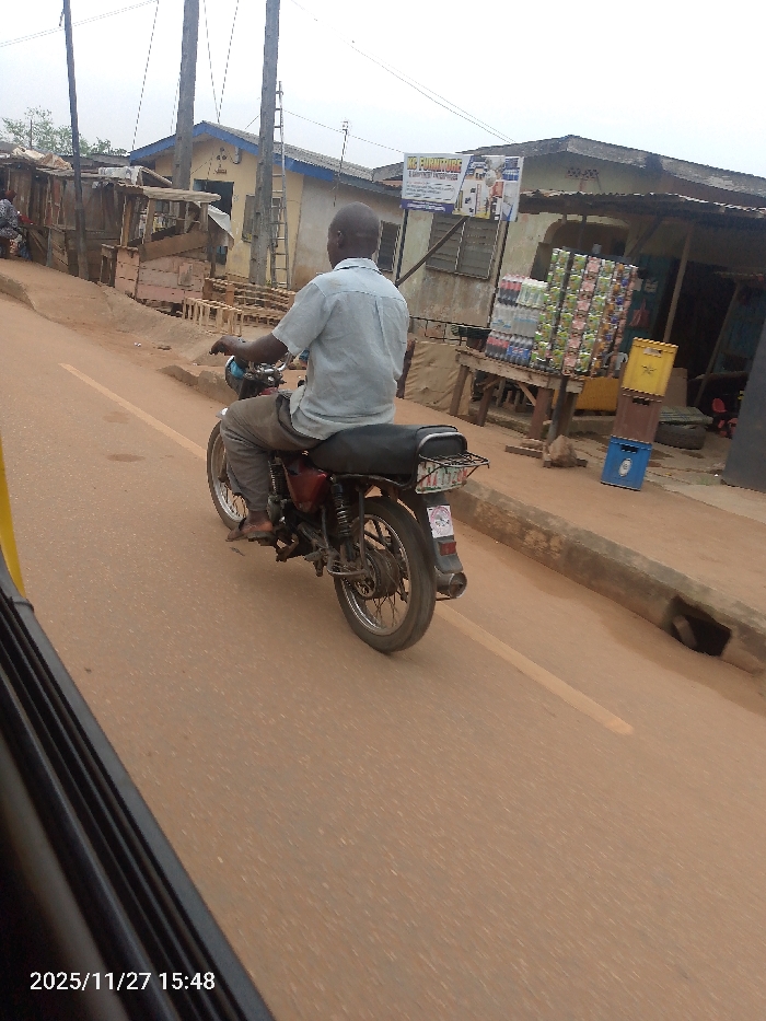 The image displays an outdoor street scene in the city of Unknown, Unknown, recorded on 2025/11/27 at 15:48. A male, observed from the rear, operates a dark-colored motorcycle on a reddish-brown paved road marked with a single yellow line. He is dressed in a light-colored, short-sleeved collared shirt and dark trousers. The motorcycle features a rear cargo rack and an exposed exhaust pipe, with a white and red sticker affixed to its rear fender. To the right of the road, a concrete curb with a visible drainage cut separates the pavement from an unpaved area. Adjacent to this area is a commercial setup: a wooden table loaded with numerous stacks of plastic beverage bottles, and stacked yellow and blue plastic crates on the ground. Above this display, a sign for "RG FURNITURE & EQUIPMENT ENTERPRISES" is visible. Behind this commercial activity, a light-colored building with a dark roof and horizontal window blinds is present. To the left of the road, multiple wooden utility poles with overhead lines are visible. One utility pole has a ladder leaning against it. Several unpainted wooden structures, consistent with market stalls, are also present on the left. A partial view of another individual is discernible near these structures in the far left background. The immediate foreground on the lower left is partially obscured by a dark, indeterminate object, suggesting the image was captured from within a vehicle. The sky is overcast.