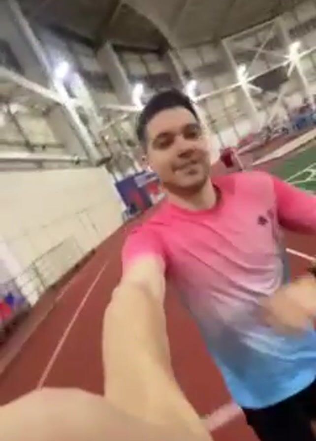 A man with short brown hair, wearing a pink and blue t-shirt and black shorts, is running on a red indoor running track. He is holding his arm out in front of him, presumably filming himself. He gives a thumbs-up at one point. In the background, there is green turf and netting, as well as the interior of a large sports complex with a high ceiling. The lighting is bright.