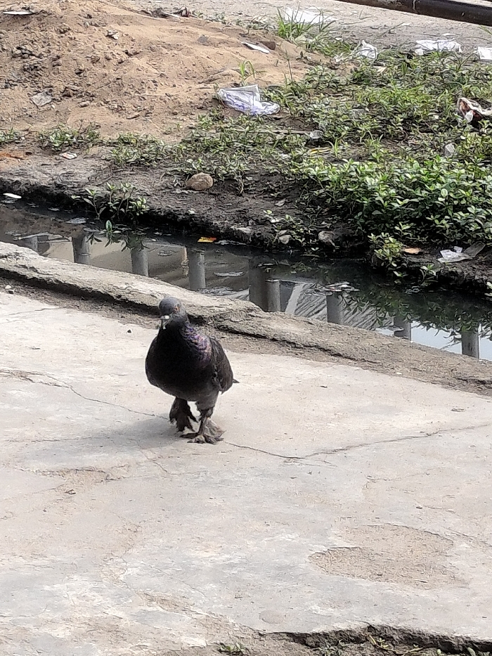 The scene, located in Alaiyabiagba, Nigeria, features a single dark gray pigeon walking on a cracked, light grey concrete surface. The pigeon displays iridescent purple and green plumage on its neck and noticeably feathered feet, facing generally forward. Immediately behind the concrete path, a narrow concrete ledge runs horizontally, bordering a murky water channel. This channel contains dark water reflecting several vertical structures, possibly support pillars or posts. Beyond the water channel, a sloped muddy bank rises, sparsely covered with green vegetation and scattered debris, including white plastic packaging and other refuse. Exposed light brown soil is visible on the upper part of the bank. No human subjects are present.