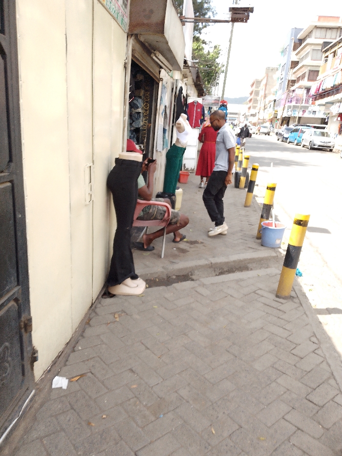 The scene depicts a commercial street in Nakuru, Kenya, under bright daylight