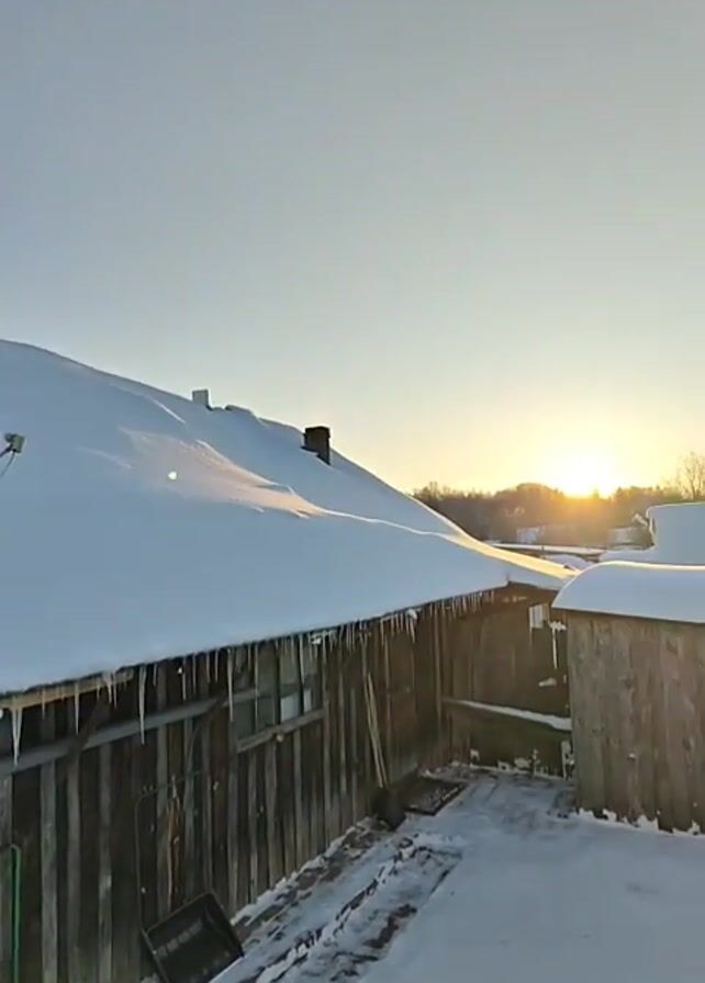 wintry scene with several wooden buildings covered in thick snow. Icicles hang from the eaves of one building. In the background, a low sun shines through trees, casting a warm light on the snow-covered landscape. A satellite dish is visible on one rooftop, and smoke rises from a chimney. The ground is also covered in snow, and some snow removal equipment, like shovels, are visible along the side of the building. The sky is clear and light blue.