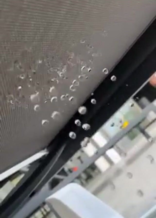 A low-angle shot shows condensation droplets clinging to the underside of a gray fabric roof