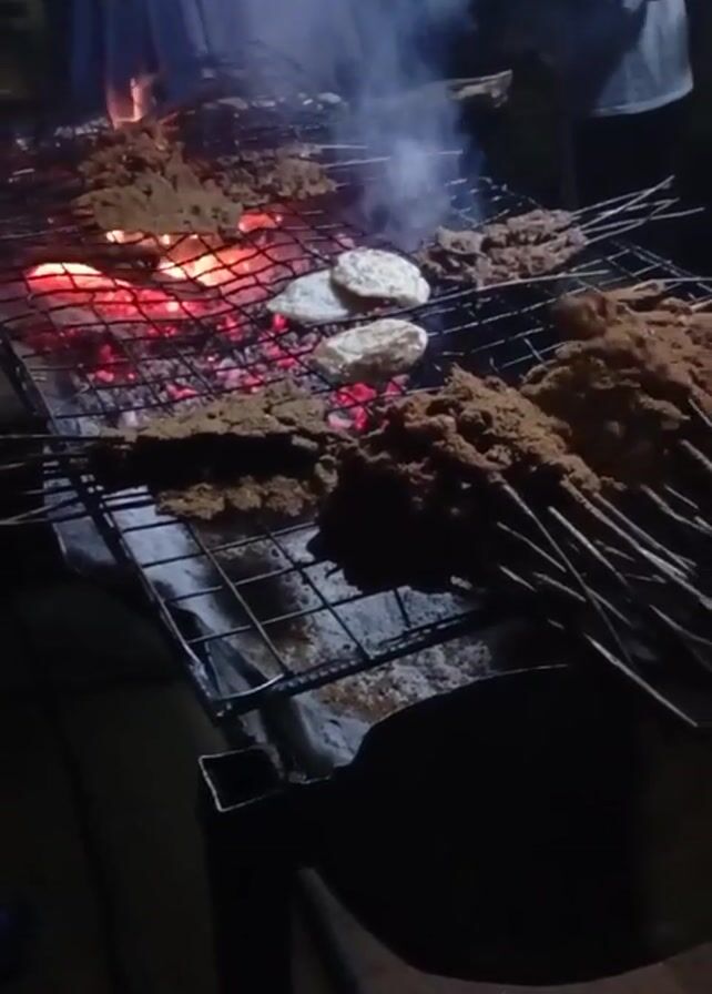 grill with food cooking over hot coals. The grill has various items, including meat on skewers, flat pieces of meat, and white patties. Smoke rises from the grill. Several people are in the background, but they are out of focus. The scene is dark, illuminated by the grill fire.