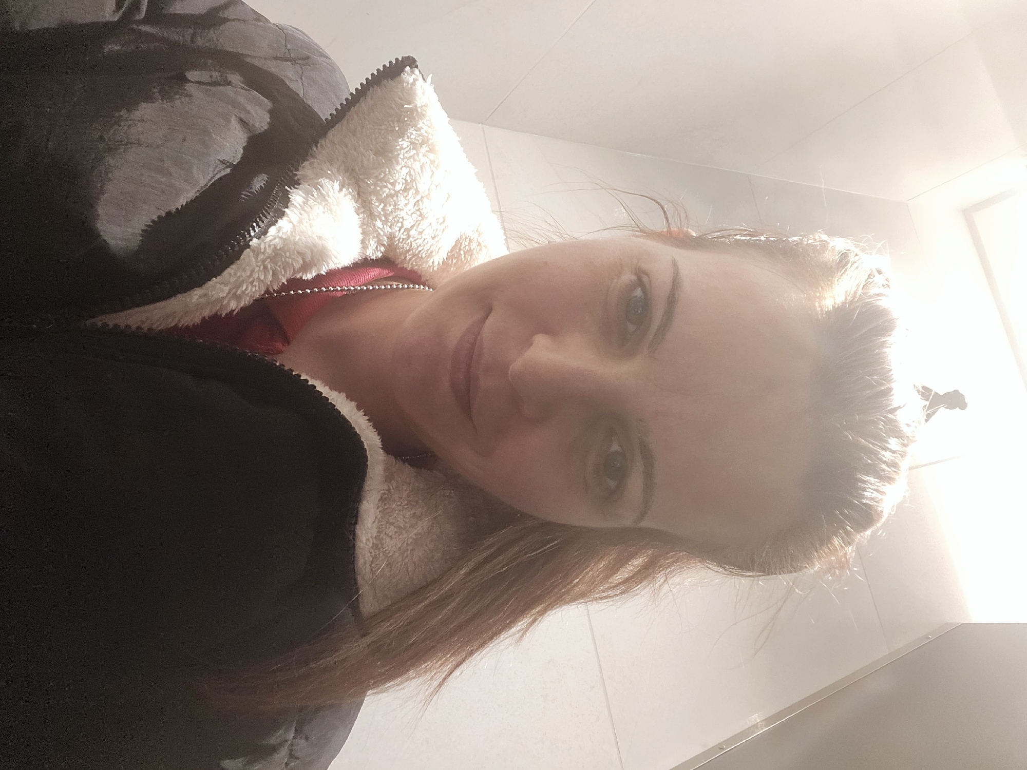 A woman is taking a selfie. She is wearing a black jacket with a white, fleece-lined collar and a red shirt underneath. The background is a bright, white tile wall and ceiling. The location cannot be determined from the image.