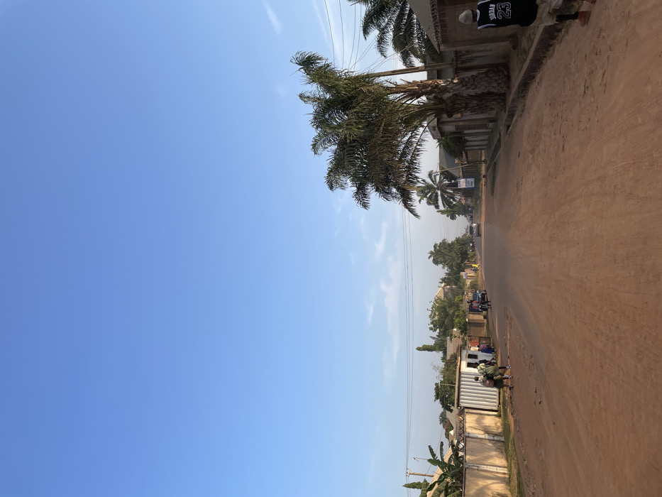 A dusty road is lined with buildings and palm trees, captured on a sunny day. The blue sky dominates the left side of the image, contrasting with the brown, earthy tones of the road and surroundings. People and vehicles appear further down the road, adding a sense of everyday life in this tropical environment. Power lines run along the roadside, blending with the natural elements.