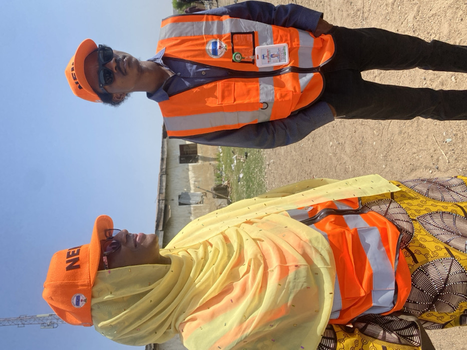Two individuals are standing outdoors under a clear blue sky in Tundun Wada South, Nigeria. The ground is dry, light brown soil. Behind them, a low-rise building with a light-colored, possibly concrete, exterior features several dark, unglazed window openings and a corrugated metal roof section. A metal telecommunications mast is visible in the far left background. The subjects include one female on the left and one male on the right. Both wear identical orange baseball caps with "NEI" in black letters and a circular logo on the front left side. Both also wear dark sunglasses and orange reflective safety vests with silver horizontal and vertical reflective stripes. The female wears a yellow headscarf (hijab) with subtle embellishments, draped over her orange vest, which covers a patterned yellow and brown garment. She is facing left, looking upwards and slightly smiling. The male wears a blue collared shirt under his orange vest, which features multiple pockets and a carabiner clip on the left side. A lanyard with an ID badge hangs from his vest, displaying "THE POLICE," a photo, and text including "COMMISSIONER OF POLICE" and "ABUBAKAR YUSUF." He wears dark trousers and has his hands in his pockets. He is facing slightly right with a neutral expression. The subjects stand side-by-side, neither directly interacting nor facing each other.