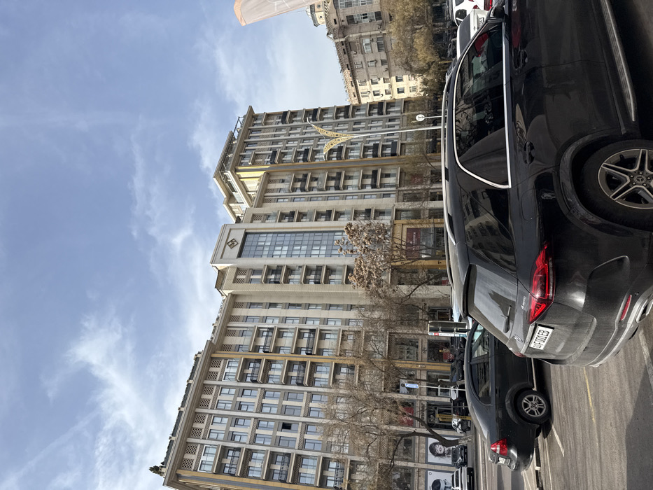 A row of tall buildings with many windows lines a city street under a blue, cloudy sky